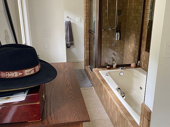 Master bedroom for rent in 3br/3ba Los Feliz hillside manor. The master bedroom and attached bathroom is 200+ square feet . The house is tucked into the Los Feliz Hills and Griffith Park, with private hiking entrance to Griffith Park trails that lead to the observatory and a stunning view of the city. The master bedroom has an attached bathroom that overlooks the backyard and rose garden. It has a tub as well as a shower and jack & jill bathroom and framed mirrors. The bedroom provides ample storage space including a large walk in closet and flat screen TV. The entire property is equipped with high-speed internet access. Additional amenities include a security system, handrails, and a dyson vaccum. A washer and dryer are also included for in-home laundry. The exterior of the property is well-maintained, providing a welcoming atmosphere with a unique multi-level terrace and brick facade housing orange trees, lemon trees, a rose garden, and a wide array of other plants. The top level terrace of the property features a waterfall and outdoor kitchen/bar/dinner table with unparalleled views of the city and the mountains. The property has a main kitchen and butler kitchen, as well as a dining room and two outdoor terraces on the bottom level including an outdoor dining table with retractable chairs and a gas grill.