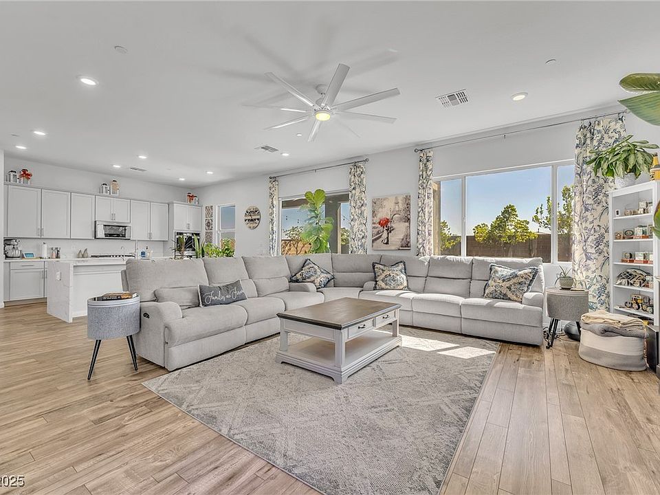 Welcome to this 5-bed, 4-bath, 3,089 sq ft home on a spacious corner lot with no rear neighbors and a park just behind. Built in 2020, it's designed for modern living with soaring 10' ceilings downstairs, 9' upstairs, and a bedroom downstairs with en-suite. The chef's kitchen boasts quartz counters, double ovens, Whirlpool stainless steel appliances, crown molding, and extensive Timberlake cabinetry with a walk-in pantry. Entertain with ease thanks to Alexa lighting downstairs, wired audio inside and out, and an outdoor kitchen with BBQ. A Rheem tankless water heater, water softener, WiFi-enabled garage opener, and ION solar panels (paid off by closing) add everyday convenience, while the backyard is pool-ready with electrical already run. Enjoy desert landscaping, herringbone pavers, and breathtaking Strip and Red Rock views from the loft and balcony. A blend of comfort, style, and smart upgrades make this home truly move-in ready!