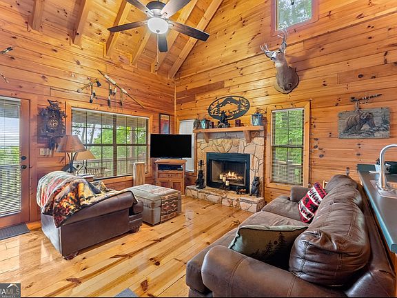 Escape to your own mountain retreat with this charming two-bedroom, one-bath log cabin nestled on 2.34 acres of serene beauty. The spacious two-story living room features a stunning stone fireplace and windows that frame long-range mountain views, filling the space with natural light and warmth. Enjoy the breathtaking scenery from two covered decks-perfect for relaxing mornings or peaceful evenings-the lower deck even includes a hot tub for unwinding under the stars. The master bedroom is conveniently located on the main level alongside the full bath. A matching storage building provides additional space for your outdoor gear or tools. Ideally situated just minutes from downtown Ellijay, you'll have easy access to local dining, shopping, and all the conveniences of town. Whether you're looking for a tranquil mountain getaway or an income-producing Airbnb, this inviting cabin offers the perfect blend of comfort, charm, and mountain living.