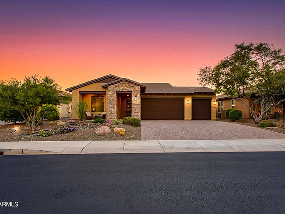 Freshly painted interior & brand-new carpet in bedrooms! This home features a sparkling pool, 3-car garage, and custom landscaping on a fully fenced oversized homesite with breathtaking sunset views. Inside, enjoy upgraded granite counters throughout, 8' doors, and a luxurious primary suite with a heavy glass shower enclosure. The open-concept dining and living area showcases a full corner of sliding glass walls, seamlessly blending indoor & outdoor living. Step out to the covered patio with motorized sunshades, creating the perfect extension of your living space. A rare combination of privacy, upgrades, and resort-style comfort.