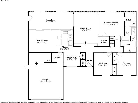 Home Features and Amenities: Air Conditioning, Bonus Room, Fenced Yard, Garage, Granite Countertops, Long Lease Terms, Patio, Pet Friendly, Pool, Primary Bedroom on Main, Recessed Lighting, Single Story House, Smart Home, Stainless Steel Appliances, Tile, Walk in Closet, W/D Hookups, and professionally managed by Invitation Homes.