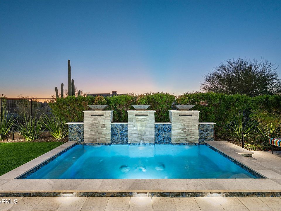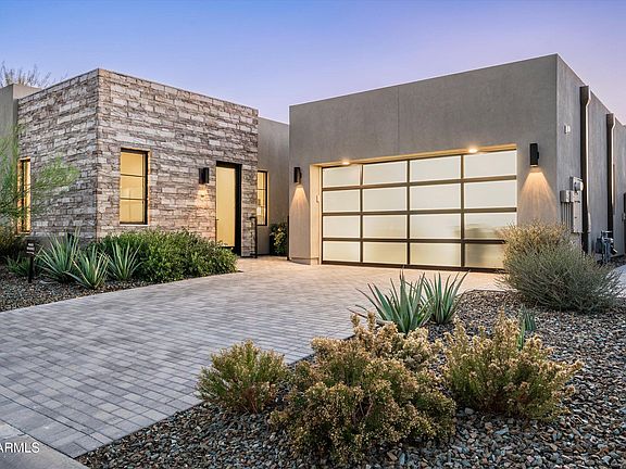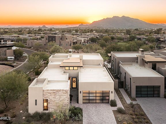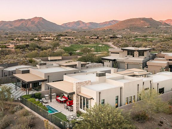 Full golf membership available at this stunning contemporary villa in the community of Seven - Desert Mountain. Built by Camelot homes on a premium lot overlooking the 12th hole, this architectural gem has a coveted floor plan that maximizes indoor/outdoor living, guest accommodations, and sweeping views of Black Mountain and desert sunsets. The bright and spacious great room opens with fully pocketing glass doors to the outdoor space complete with a large covered patio with in-ceiling infrared heaters, gas fire pit, BBQ island, and heated and jetted spool. The interior living spaces are outfitted with upgraded finishes throughout, including designer porcelain tile, Savant home automation, Wolf and Sub Zero appliances, and custom lighting. The split primary suite is complemented by a comfortable office/den, cozy guest room, and a separate casita entrance welcomes additional guests to their private suite. This unique property combines modern desert living with a premier location and amenities only available in the spectacular Desert Mountain community.
