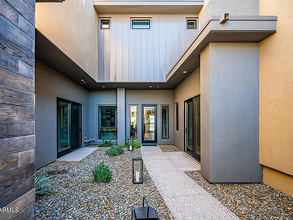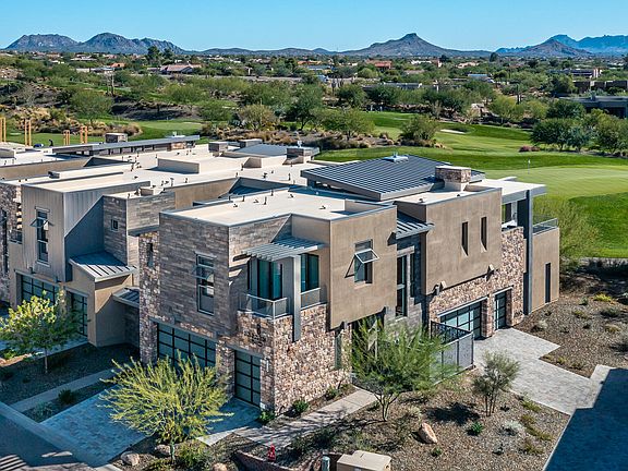 Luxury easy living! This gorgeous unit has its own private courtyard entry. Open floor plan with lots of daylight. The gourmet kitchen has a beautiful custom tiled backsplash wall contrasting perfectly with the upgraded stainless steel Wolf appliances. Waterfall quartzite countertop with plenty of barstool seating for casual dining. French oak flooring and upgraded design finishes throughout. Primary bedroom has its own patio to enjoy a morning coffee. Primary bath has a soaking tub, tile flooring, designer finishes and beautiful neutral decor. Guest bedrooms/ office have access to the private front courtyard. Telescoped doors to outside covered patio for easy indoor/outdoor living. All properties within the Seven Desert Mountain community require Membership in the Desert Mountain Club.