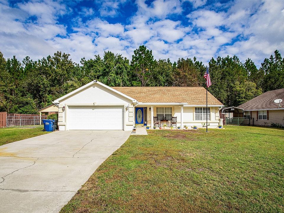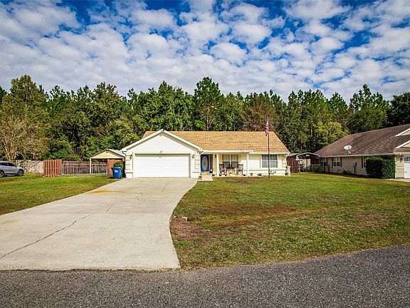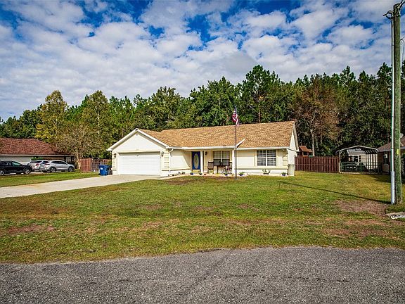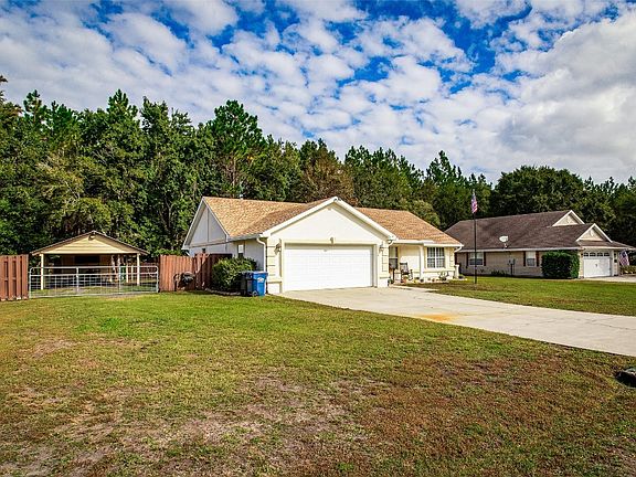 The master bathroom has been completely renovated and includes his and her sinks, new modern lighting, soft-close cabinets, and a luxurious walk-in shower with double shower heads! The guest bathroom has also been fully updated and features attractive luxury vinyl plank (LVP) flooring for durability and style. Convenience continues with easy access to the cute country kitchen directly from the garage. The kitchen includes a dining area and offers two entrances into the large family room, which also leads to the backyard. Outback is a Pole barn with covered parking for your truck or boat, along with a workshop with electricity. Experience the tranquility of cul-de-sac living, with minimal traffic and enhanced safety for children and pets, and NO HOA or CDD FEES! The nearby retention pond offers a scenic view from the front porch and a perfect spot for unwinding after a busy day. Schedule a private tour today to discover everything this lovely home has to offer!