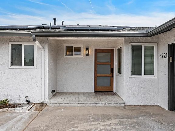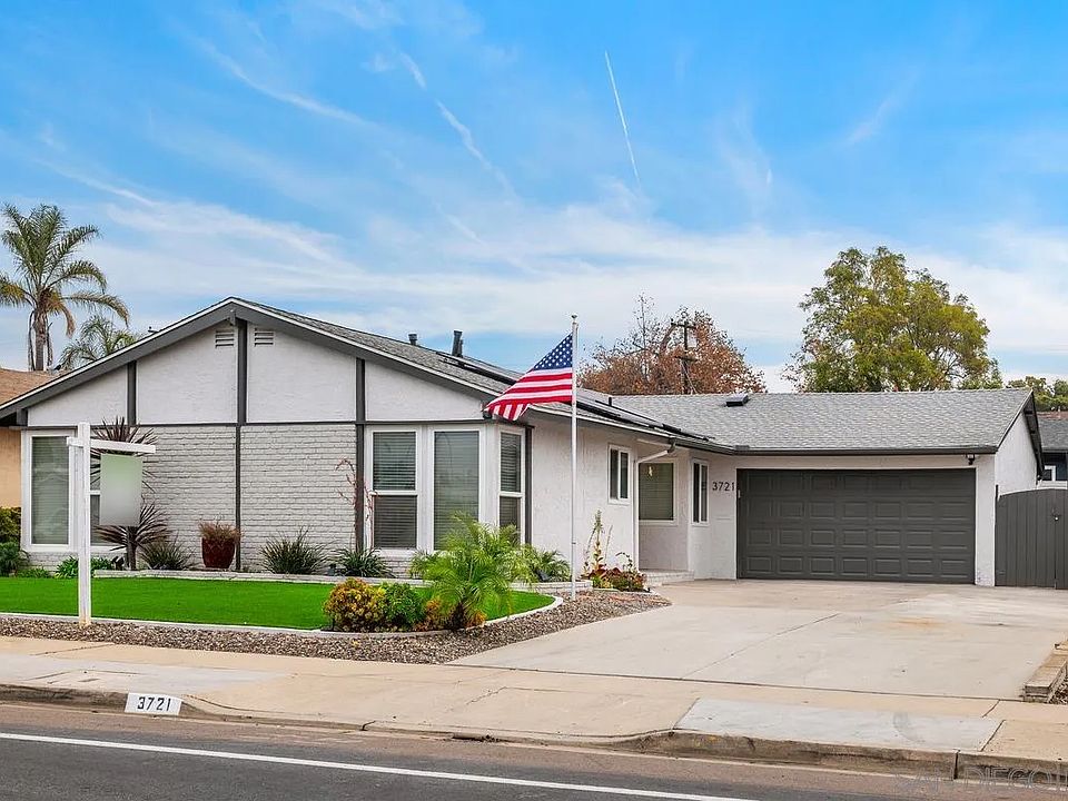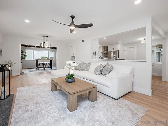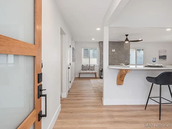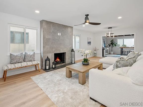 Beautifully remodeled, single level home on a coveted Mount Street; this one has it all including OWNED SOLAR! Step into the open floor plan interior that allows highly functional living; with large remodeled kitchen with lots of cabinet and counter space, quartz tops, custom backsplash and new SS appliances, and 42" bar height counter for dining and overlooking living room, perfect for entertaining. Living area also features a custom tiled fireplace ready for TV, LVP flooring throughout, and bonus CA room on the rear for flexible space. Nicely appointed remodeled bathrooms with custom tile and blue vanities. Enjoy San Diego living on the outside of this home featuring well manicured, low maintenance landscaping, and great outdoor living space Gazebo for family gatherings. Some other recent upgrades include: plumbing and electrical finishes, doors, base, casing, painting inside and out, new FAU & Condenser, and so much more! The home is located in a central neighborhood in San Diego with easy access to freeways, beaches, parks, hiking, dining, and entertainment, making it perfect for those who enjoy an active lifestyle.