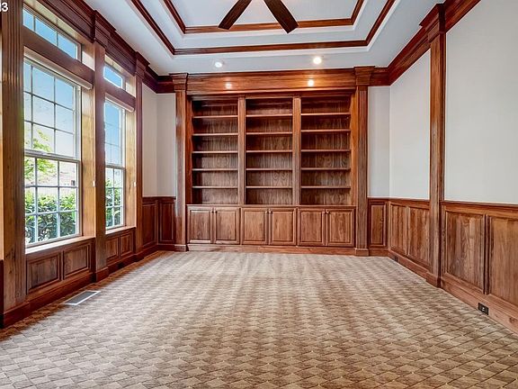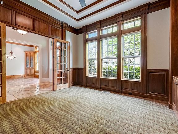 - Features: Bookcases, Builtin Features, Ceiling Fan, French Doors, Garden Window, High Ceilings, Wainscoting, Wallto Wall Carpet