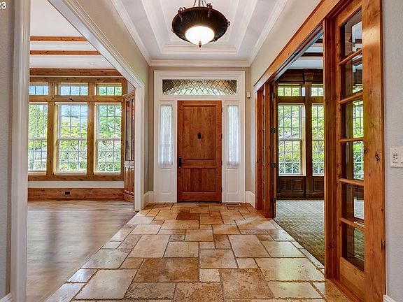 This stunning single-level home boasts traditional architectural details, extensive built-in features and gorgeous trim work throughout. As you enter the foyer, you're welcomed by high ceilings with crown moulding. Tall windows throughout the home fill each space with natural light, highlighting the new interior paint. To your left, the office awaits with inviting French doors, richly toned wainscoting and matching built-in bookcases. To your right, the formal dining room invites you in with tasteful built-in display cabinets, offering the perfect setting for memorable dinners. The refinished walnut hardwood floors lead into the living room where you'll find a beautiful fireplace anchoring the space. Built-in media cabinets and peaceful garden views make it the perfect place to relax and unwind. The gourmet kitchen is well appointed with a center island, granite counters, Viking range and timeless cabinets with integrated fridge, providing ample storage. A spacious breakfast nook with built-in buffet and second sink is the perfect place for easy gatherings. The primary suite is a luxurious retreat with a private exit to the backyard, double-sided gas fireplace and walk-in closet fitted with organizers. The primary bathroom is brightened by a skylight and features granite counters, double vanity and walk-in shower with double shower heads. New carpeting in the bedrooms adds an extra touch of comfort to this beautiful home. The front yard is fenced with a gated driveway and offers low-maintenance artificial turf for year-round curb appeal. The back yard is perfect for entertaining with a covered patio, outdoor fireplace and detached garden shed. A hardwired backup generator and security cameras provide peace of mind and convenience. Private setting with quick access to the restaurants, shops and services of downtown Lake Grove. Don't miss the chance to own this incredible property in one of the most sought-after locations in Lake Oswego. Eligible for 3 Lake Easements.