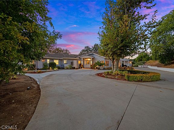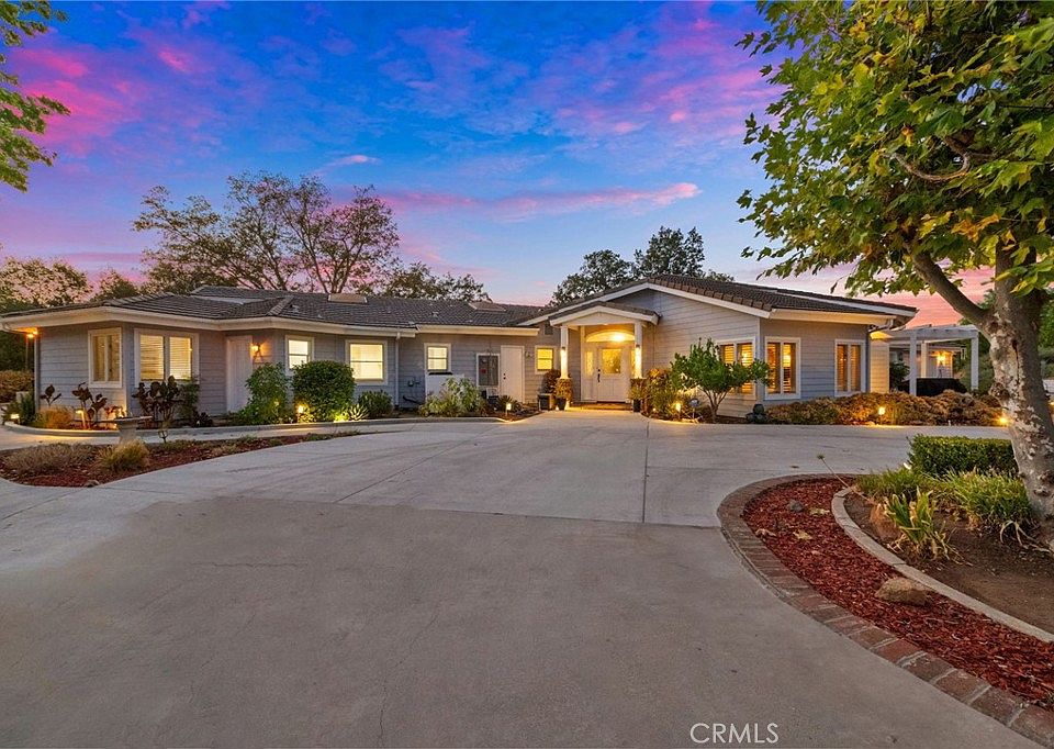 Discover your secluded equestrian paradise on over five pristine acres, nestled among ancient oak trees in the highly desirable La Cresta community. This enchanting estate offers a serene, park-like ambiance that captivates at first sight. Inside the main residence, you'll find nearly 3,000 square feet of thoughtfully updated living space, featuring energy-efficient amenities such as 48 solar panels, a new septic system, and a fresh well pump. While the home is connected to city water, the well ensures low irrigation and barn maintenance costs. The open floor plan, vaulted ceilings, and exposed beams create a welcoming and spacious atmosphere, complemented by wood-look tile flooring and bespoke lighting. The cozy wood-burning fireplace adds a touch of rustic charm, while the modern kitchen shines with quartz countertops, sleek cabinetry, and new stainless steel appliances. A flexible den offers the option to add an extra bedroom to meet your needs.