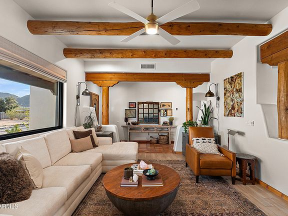 Welcome to your Southwestern adobe oasis! This stunning 3 bed, 2 bath updated home features authentic vigas & Kiva fireplace. Main home is 1818 sqft & guest home is 1000 sqft. On a private 1.17 acre lot, this home offers an RV carport w/hookups, & a large 4 car shop —perfect for all your storage or workshop needs. The spacious guest house includes separate living room, bedroom, 3/4 bath & interior laundry—ideal for family, guests or extra income.