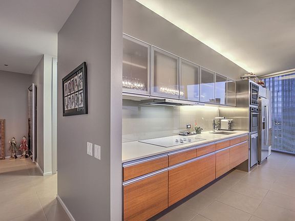 Sleek finishesFloor-to-ceiling glass wallsSmart-home lightingStainless steel appliancesOpen layout