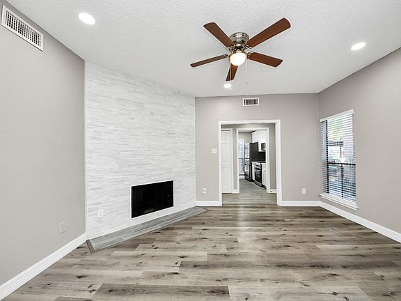Beautifully remodeled first-floor condo in a gated community with a pool and a prime location near Beltway 8 and Westpark Tollway. This 1-bedroom, 1-bath home features modern colors, new flooring, cabinets, countertops, stainless steel appliances (including refrigerator), and ceiling fans in every room. The open kitchen connects to the dining area with a dine-in bar, and the separate living room showcases a cozy wood-burning fireplace. From the dining area, step out to a spacious private patio—perfect for relaxing or entertaining. The primary bedroom also offers its own private balcony, giving you two outdoor spaces to enjoy. Recent updates include fresh paint, a new patio door, a serviced HVAC system, and a replaced electric panel. The home also includes an in-unit laundry area ready for a stackable or combo washer/dryer. Convenient first-floor location right next to covered carport parking—move-in ready and ideally situated near restaurants, shopping and parks. 3D tour available!