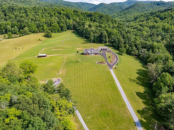 Welcome to your own paradise! If you've ever dreamed of owning an incredible property with captivating views, lots of acreage, room for horses/cattle, and sights of wildlife - this is it! As you enter the property, you will be met with a long, newly partially-paved private driveway equipped with stunning landscaping. This property has so many amazing amenities to mention; from the spring-fed pond stocked with trout to the breathtaking mountain views, it will feel as-if you're on a permanent vacation. Two creeks flow through the property, making this the perfect place to spot lots of wildlife- a hunters dream! Multiple structures on the property have been completed within the last couple of years, including a large 35x58 utility barn, a 3-bay detached garage, and a horse feeding barn. Another barn is located on the property as well and there is wooden fencing around many pastures for horses or cattle. Moving onto the stunning brick home, it offers a covered front and back porch area, as
