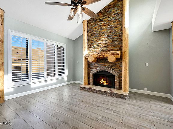 Wood burning fireplaceCommunity poolWet barWood-look tile flooringStainless steel appliancesNeutral tonesHeated spa