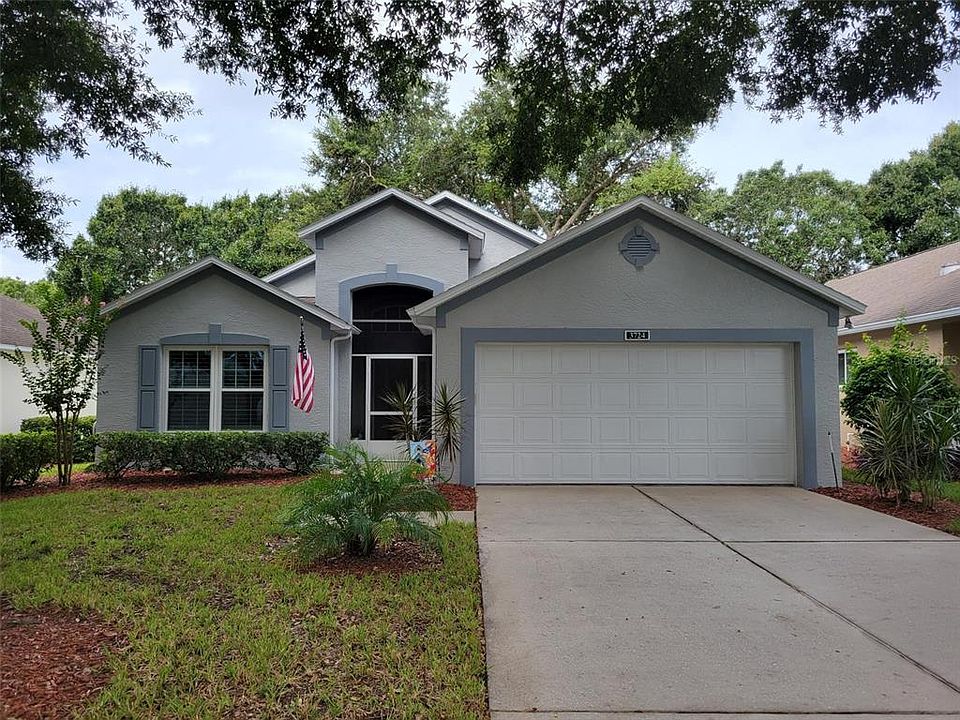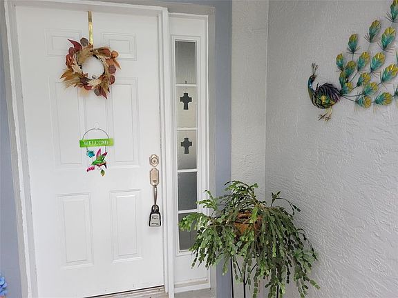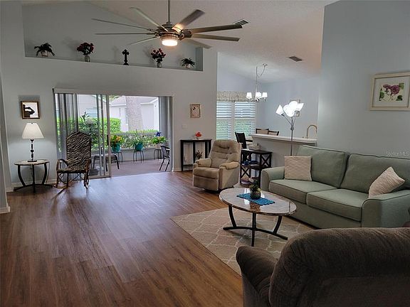Magnificent home in highly sought-after 55+ Kings Ridge. This lovely Sherwood model boasts two spacious bedrooms and two baths with 1410 square feet of living space. Entering the home at the foyer features a Great Room Floorplan with a spacious Living Room. Just off the Living is a gourmet kitchen with Breakfast Nook. The Great Room opens up to the Covered Screened Lanai through a sliding glass door. The primary bedroom features an En Suite bathroom. Home includes a 2 car garage with door opener. Interior laundry Room with Full Sized Washer & Dryer included. All kitchen appliances are also included in the sale. Also included in the sale is the massive 85 inch TV in the Living Room. Enjoy the safety of a guard gated community and beauty of tree lined streets and amazing community amenities including a multi-million-dollar clubhouse. Live the Royal lifestyle with two 18-hole golf courses, three heated pools, two fitness centers, spas, tennis & pickle ball courts, billiards, shuffleboard, shows, Bingo, Dancing, cards, crafts, movie & food truck nights and join any one of the many clubs galore. HOA dues include lawn maintenance & irrigation, exterior painting, landline phone, basic cable and internet and all community amenities. Close to Highway 27 and 50, Florida Turnpike with easy access to downtown Orlando within 30 minutes & twenty-two miles to Disney. Conveniently located outside the community: golf cart accessible Publix, University of Florida urgent care center, doctors, dentists, Walgreen’s pharmacy, Quest and close to Costco, Kohls, Walmart, BJs and numerous restaurants within five miles. At least one buyer must be at least 55 years old or older for HOA approval. Age of Items: Interior Paint - November 2024; Exterior Paint - June 2024; New Energy Efficient Windows - July 2022; Plantation Shutters - July 2022; Luxury Vinyl Plank Floor installed throughout the home - July 2022; New Washer & Dryer - 2022; New Toilets - 2022. Call for a private tour of this fantastic home.