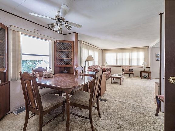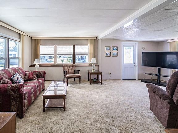 Beautiful Corner Lot in Tropical Mobile Park! Discover this charming nicely maintained 1966 mobile home with additions and two storage sheds — offering plenty of space and functionality in a small community. Step through the front door into a fully furnished home where the spacious living room welcomes you with built-in bookcases and flows seamlessly into the dining area and kitchen. The dining room includes built-in corner cabinets and a dining set, while the kitchen is equipped with a refrigerator, range, dishwasher, and ceiling fan — everything you need to move right in, plus there are three Televisions that convey! The primary bedroom is large and features laminate flooring and three closets with the primary bathroom in the hallway that has with a walk-in shower and a built-in, pull down bench for added comfort. A second bedroom is also large and has two closets could also serve as the primary suite. Step outside to the carport area, where you’ll find two sheds — one with a washer, dryer, and utility sink, and another for your gardening tools and storage. Additional features include Roof-over, shutters, mostly updated windows, blinds, and move-in ready furnishings. Community amenities include a clubhouse and shuffleboard courts for your enjoyment for a low annual fee of $210. The seller will cover the $500 road maintenance buy-in fee for the buyer — a fantastic value! Don’t miss this opportunity to own a lovely home on a prime corner lot in the sought-after Tropical Mobile Park. Call today to schedule your private showing — this one won’t last!