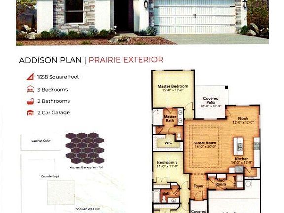 This Addison floor plan features a great room with coffered ceiling that flows into an open concept kitchen and spacious dining nook. A quiet master bedroom extends into the back yard and leads into a luxurious master bath with walk in closet. There is a mud room immediately near the 2 car garage and foyer to provide a space to organize your daily essentials. Two bedrooms near the front of the home are located near the 2nd full bathroom and foyer yet retain their privacy and comfort. Back yard is enclosed by a block wall fence and covered back patio. Front yard is xeriscaped with plants on a drip system.