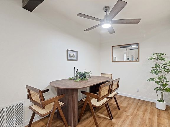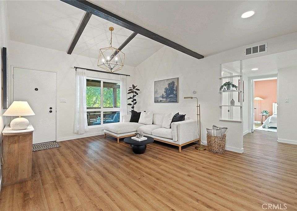 Fully remodeled in 2022, this residence boasts a new HVAC system and ducting, dual-pane windows, recessed lighting, waterproof laminate flooring, and tastefully renovated bathrooms and kitchen with contemporary finishes throughout.