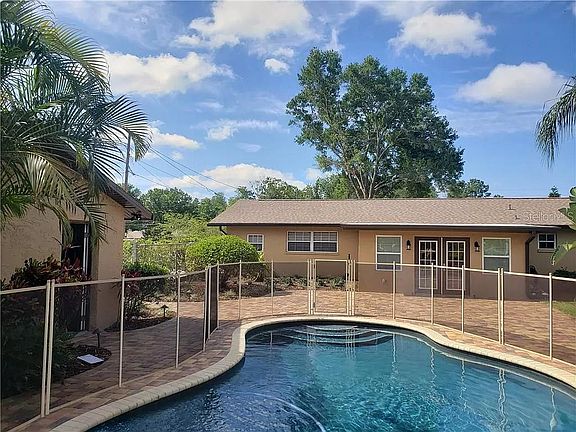 Price included lawn and pool maintenance. No Dogs, No Exceptions. This beautifully updated 3 bedroom 2 bath home with over 2000 sq ft of living area sits on almost an acre of tropical paradise. Plush landscaping and palm trees surround the pool area . Beautiful lighting is in place for evening gatherings. The home has just been tastefully remodeled in warm earth tones to include new bathrooms, a brand new kitchen with granite counter tops, all new paint and flooring as well as a new roof and new a/c. There is an office area with a storage closet possible 4th bedroom which has its own entrance. The one car garage is detached and includes a workshop area. The home offers a security system and is fully fenced and gated. Call today to see this home. Rental price includes lawn and pool maintenance. Good credit and clean backgrounds only. No smoking in the home and no dogs please.