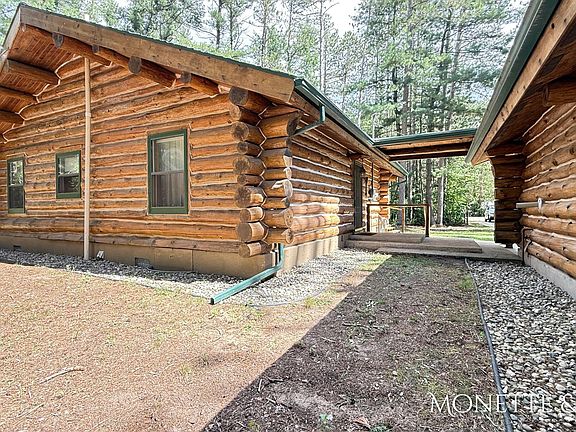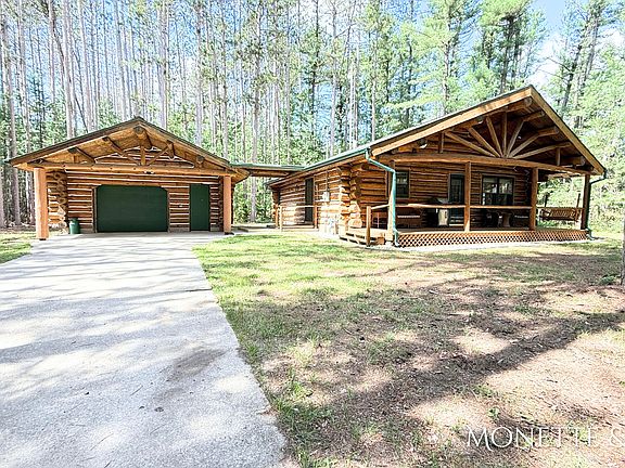 Tucked among towering pines, this beautifully crafted and meticulously maintained log home offers over 7 acres of serene living in the highly desirable Reeths-Puffer School District. Enjoy a peaceful natural setting with mature trees, winding nature trails, and abundant wildlife right outside your door. While the home radiates rustic country charm, it's also conveniently located near golf courses, major highways, shopping, and Michigan's Adventure. Exterior features include an oversized heated one-stall garage, a 30' x 8' covered front porch perfect for relaxing, and a storage shed for all your outdoor needs. Inside, thoughtful details shine with abundant built-in cabinetry and shelving, and all appliances are included for a truly move-in-ready experience. This exceptional log home has been expertly built with perma-chink joint sealant, ensuring durability, weather resistance, and timeless beauty for years to come.