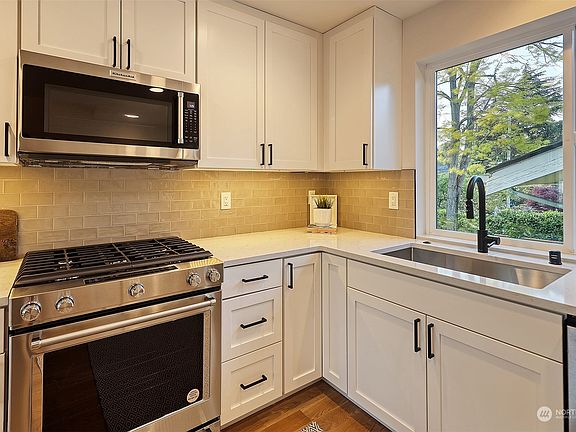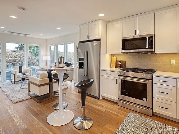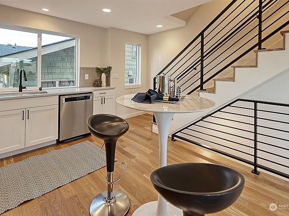 LAST UNIT at this beautiful urban oasis in the heart of Wallingford! Modern aesthetics, designer finishes, & hardwood flrs throughout are just the beginning! South facing windows flood the home w/ natural light. Mini splits provide efficient year-round comfort. Enjoy great restaurants nearby & easy access to parks & trails. Breathtaking views of Lk Union, the city, Space Needle, Olympics & Cascades from your private rooftop terrace! Walls of windows frame every space for optimal natural light, including the primary suite occupying the entire top floor, polished bath & convenient washer/dryer on same level. On the ground floor you will find 2 BRs great for guest suite or home office plus one full bath. Convenient, EV-ready off-street parking