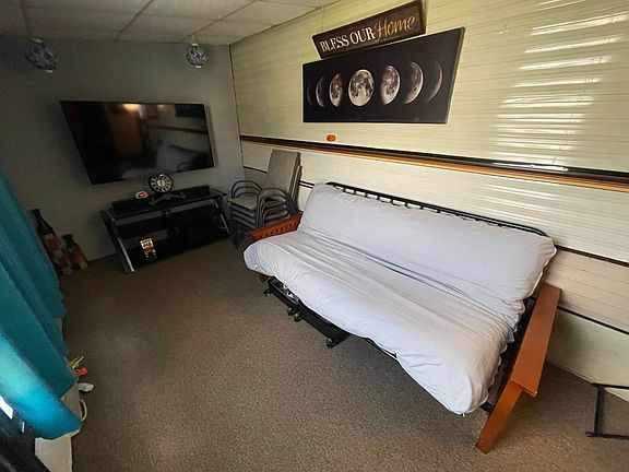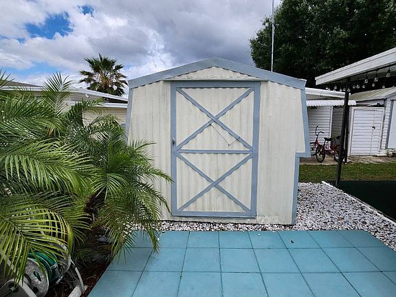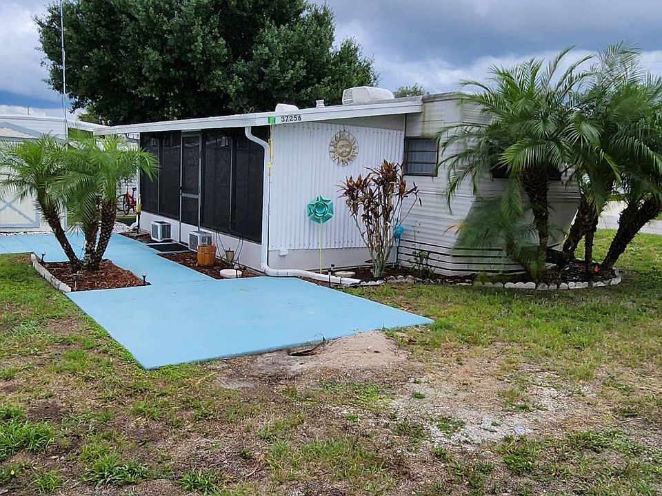 1 Bed, 1 Bath, Corner Lot, furnished home with carpeted Florida room with unit AC. Inside the main home there is laminate flooring, there is a cozy living area. The kitchen has a gas stove, lots of cabinet space and eating nook. This home has roof air. Walkthrough bathroom with shower tub. Bedroom has a full bed with wall mounted TV and extra storage. Wont last long, call today for more information!