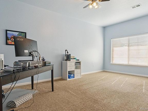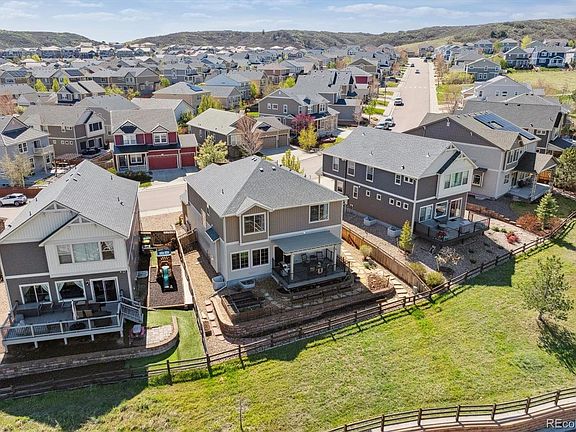 Welcome to this beautifully maintained and light-filled home, perfectly positioned to capture stunning views of the mountains and Bison Park. From the inviting front porch to the thoughtfully designed interior, pride of ownership shines throughout. Step inside to discover a bright, open layout with trendy laminate flooring on the main level and an expansive great room featuring a cozy electric fireplace and picture-perfect mountain views. The kitchen is well equipped and stylish-complete with granite countertops, snazzy backsplash, a large center island with seating, a gas cooktop, pantry, and direct access to a functional mudroom with built-in bench, hooks, and storage. A spacious main floor study with double French doors offers a quiet retreat for work or reading. Upstairs, a generous loft connects four bedrooms, each with lighted ceiling fans. The full bath includes dual sinks for convenience. The primary suite is a true escape with a tray ceiling, niche for seating or a dresser, and a spa-like ensuite featuring a doorless walk-in shower, double vanity, and walk-in closet. The finished basement adds versatile living space with beautiful wood accent walls, laminate flooring, a recreation area perfect for a gym, office, or entertainment, plus a half bath and two storage areas—one behind a charming sliding barn door. Step outside to a covered deck overlooking a greenbelt and Bison Park. Enjoy mountain views, garden boxes, and a low-maintenance yard ideal for relaxing or entertaining. Additional features include a new roof, central air, EV charger, and 4 outdoor security cameras & a 2 1/4 garage space-gives you just a little extra space for work bench, garden tool, bikes and more! Unbeatable location—walk to local schools, nearby restaurants, and Ridgeline Open Space for your afternoon hike. Community pools, tennis courts, and parks are just minutes away. Quick access to the hospital, I-25, and the Outlets.