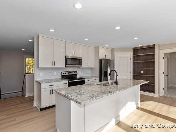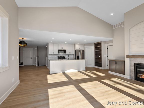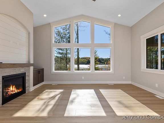 Offering over 2,400 sq ft of living space, this home features a spacious great room with vaulted ceilings, a cozy fireplace, custom built-ins, and beautiful water views.