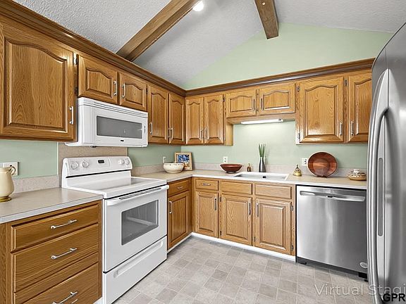 Nicely landscaped yardMature treesOpen beam vaulted ceilingFormal dining roomWalk in closetCozy fireplaceNew tile flooring