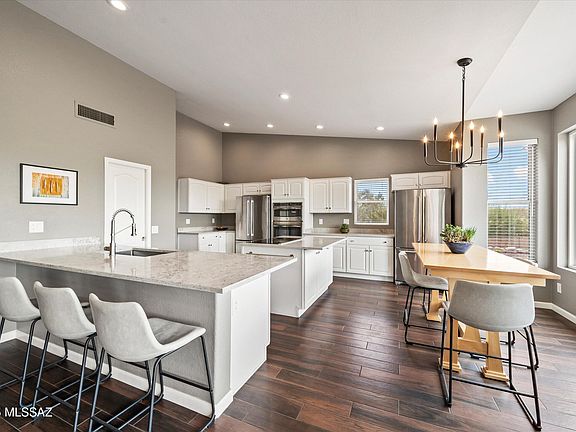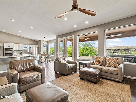 This beautifully renovated and upgraded Galleria model is ready for move-in. The double door entry leads to an inviting neutral color palette that enhances the spacious gathering and formal dining room. The island kitchen maximizes the open floorplan, offering ample cabinetry, two refrigerators, an induction cooktop, and views of the yard and surrounding open space. The expansive family room features a stacked stone fireplace, providing warmth during cool SaddleBrooke evenings. The owner's retreat includes a sitting area and an en-suite with double vanity, a walk-in shower, and double closets. Upstairs Casita offers two bedrooms and a bath, ensuring privacy and comfort for guests. Additional highlights include a convenient full bath in hallway, 4th bedroom downstairs, a den/office, a three-car garage, and a new roof installed in 2023 with updated roof tiles. Outdoor spaces feature a covered patio with commercial grade heaters, expanded hardscape, and a raised patio, ideal for entertaining or enjoying all that SaddleBrooke has to offer.