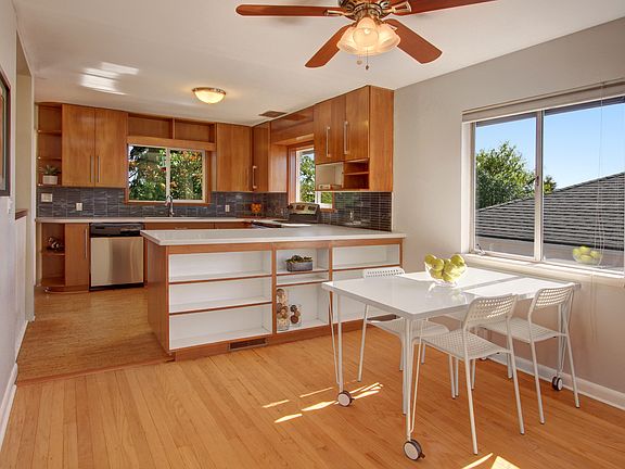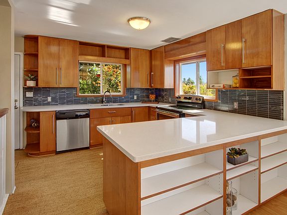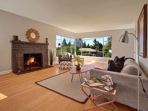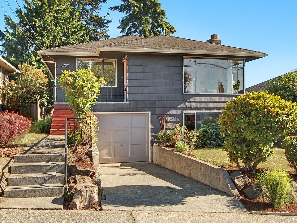 West Seattle View Mid-Century Modern! Light-filled open floor plan with hardwood floors and cozy fireplace. Updated kitchen features quartz countertops, stainless appliances, and overlooks private deck perfect for summer BBQs. Spacious bedrooms on main floor. Lower daylight level with media room, storage, 3rd bedroom/office and 3/4 bath. Attached garage with workbench for projects & room to store your kayak and bikes for outdoor fun on Alki Beach, Lincoln Park. Just blocks from coffee shops, restaurants, and grocery stores. Close to downtown Seattle. Don't miss it!