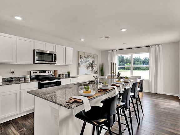 The Darwin floorplan available at Hawk's Ridge in Rossville, GA is a charming two-story home. The main level is open concept, featuring a spacious kitchen with a pantry and island with countertop seating. The kitchen overlooks an expansive living area, a well-lit breakfast nook, and an outdoor patio. There is also a powder room off the foyer for convenience. Upstairs features a desirable primary bedroom with a walk-in-closet and private bathroom. Two additional bedrooms are also on the upper level, and these each have their own walk-in-closet. An additional bathroom and laundry room complete the upstairs of this home.