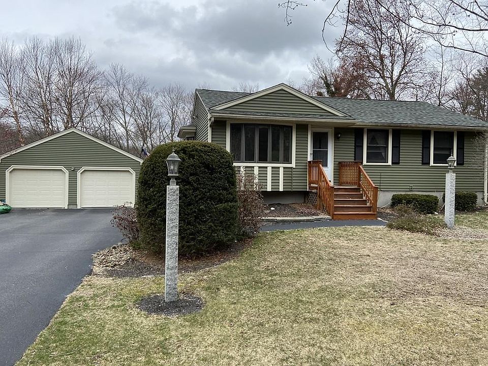 If you are looking for one-level living then this ranch in Holliston could be it. Three bedroom, two bath home with eat-in kitchen with stainless steel appliances (2 yrs), 12x20 master suite with slider to deck and with master bathroom, newer roof (5 yrs), and siding (5 yrs). Large living room with picture window, cozy family room open to the kitchen and also has a slider to the sun room overlooking the backyard. The basement has two finished rooms, utility room with laundry, and a walkout to the yard. The backyard is inviting with its beautifully appointed patio and fire pit (2 yrs), 15' above ground 4' pool (2 yrs old), shed and level back yard. Two car detached garage with plenty of storage and workbench.