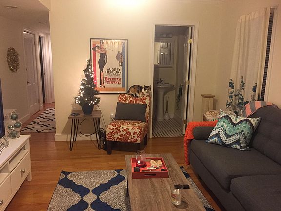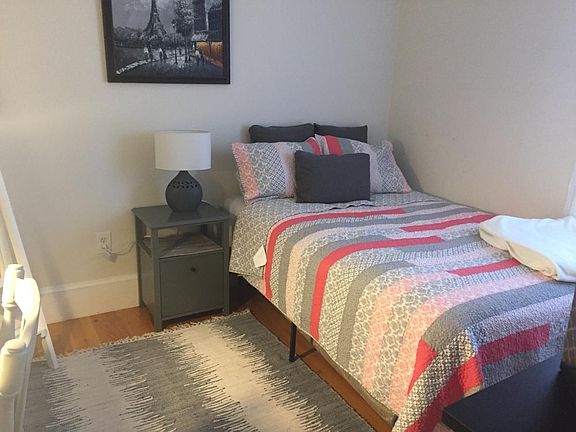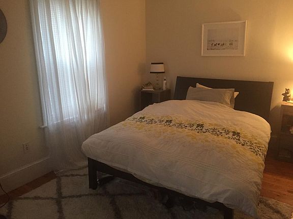 This unit is on the second floor of a house. There is an exterior private deck. There is also a shared courtyard and front porch. It has a granite kitchen with dishwasher/disposal. Hardwood floors, updated heating system and roof. Shared laundry. There is off-street parking for two cars. Walk to bus, Comm. Rail, and Green Line. Close to major highways. Avail 8/1. Cats ok, No smoking. Call Lorreen for appointments. Owner pays for water. Tenant responsible for all other utilities.
