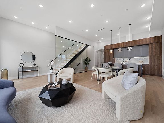 The main level opens to a grand open-concept dining and living area with soaring 12-foot ceilings, oversized Andersen energy-efficient windows, a floor-to-ceiling tempered glass accent wall, abundant natural light, and a statement-making realistic flame fireplace. The chef’s kitchen is outfitted with designer two-tone cabinetry, Thermador appliance package with paneled refrigerator and dishwasher, 5 burner range, and heating drawer. The oversized double waterfall quartz island showcases luxurious West Elm accent lighting, along with porcelain backsplash with a convenient Pot Filler, and an externally vented hood.