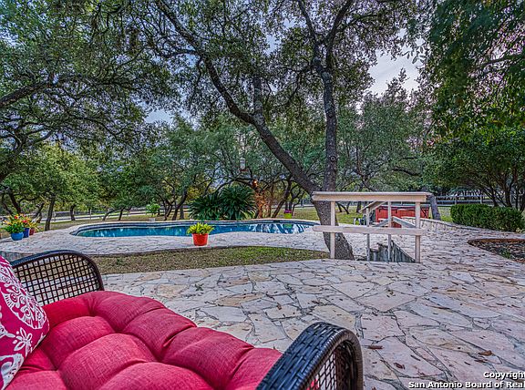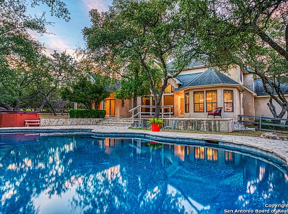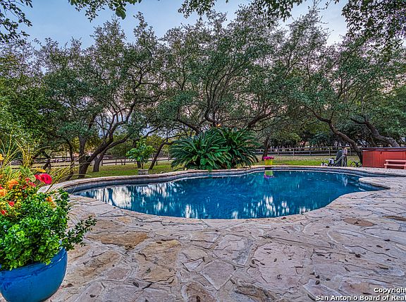 True Hill Country retreat! 2.07 spectacular acres hug this custom Stadler home! 20 ft ceilings in the great room with stunning stone fireplace and full wall window views of the sparking River Oaks pool.Warm kitchen is the heart of the home and boasts a double oven, custom cabinets, and a walk in pantry!Master bedroom is oversized and enjoys its own private backyard oasis access. Secondary full bed/bath down! Upstairs game room, office and 2 additional split bedrooms! Horses allowed! Walk to shopping/dining!