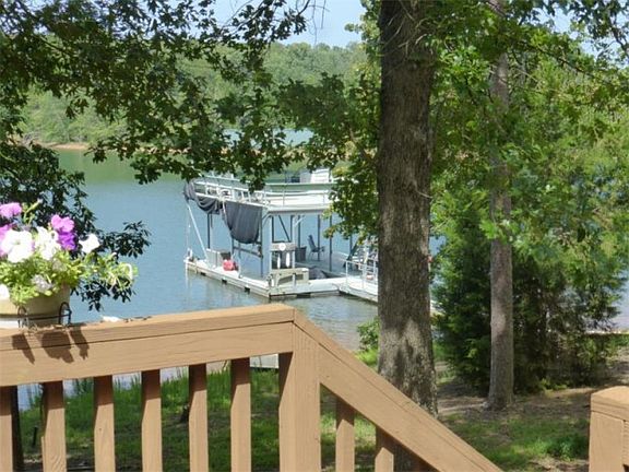 Lakefront 3BR/3B home/warm/inviting/very close to the water's edge/private lot/wonderful wide open views enjoyed from 2 story cov.party dock, screened porch,multilevel decks, while soaking in hot tub lakeside or patio on terrace lev. Kitchen w/Corian counter tops, tile back splash, HW flrs,brkfast bar open to fam.rm.w/vaulted ceiling,masonry FP, built-in/HW floors. Terrace lev. offers more built-ins, rec. rm w/FP/bath/laundry. Detached building w/garage/hobby rm/workshop/ high ceilings/lots of great cabinets, desk, bed and built-in cubby spaces. Close to town too!