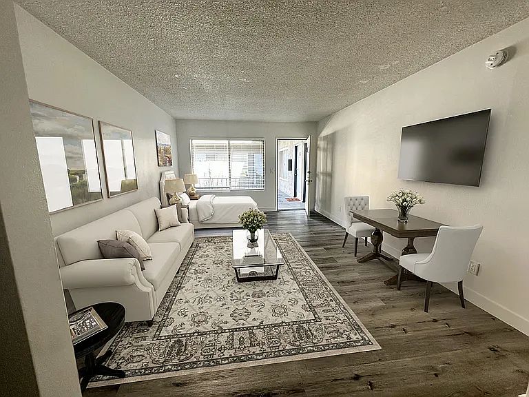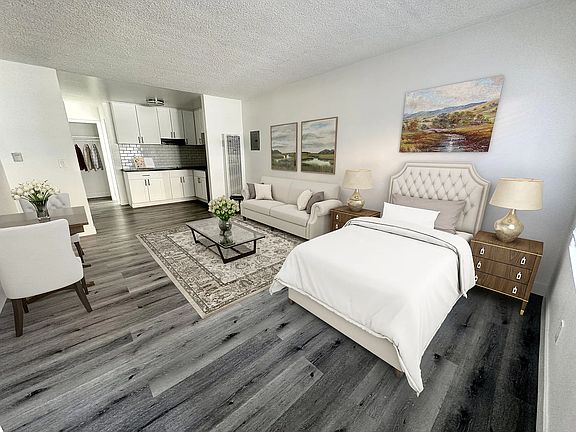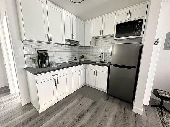 A bright and airy studio apartment with modern finishes. This charming unit features quartz countertops, a subway tile backsplash, and a two-burner electric cooktop. Wood flooring runs throughout the space, adding warmth and style, while the built-in vanity desk area provides a convenient spot for work or getting ready. With two spacious closets and plenty of natural light, this studio offers both comfort and functionality in a well-maintained building.