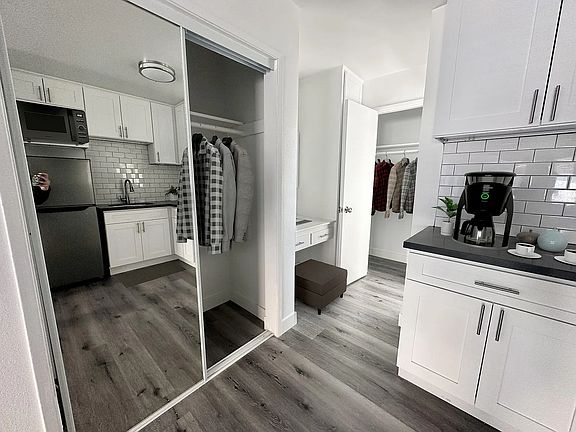 Subway tile backsplashNatural lightQuartz countertopsWood flooringTwo-burner electric cooktopSpacious closetsBuilt-in vanity desk area