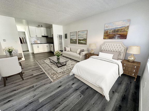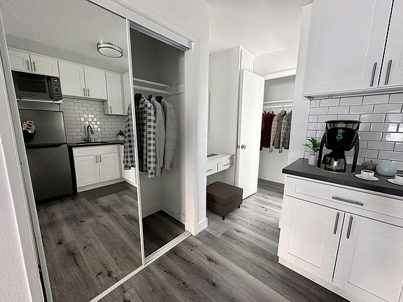 A bright and airy studio apartment with modern finishes. This charming unit features quartz countertops, a subway tile backsplash, and a two-burner electric cooktop. Wood flooring runs throughout the space, adding warmth and style, while the built-in vanity desk area provides a convenient spot for work or getting ready. With two spacious closets and plenty of natural light, this studio offers both comfort and functionality in a well-maintained building.