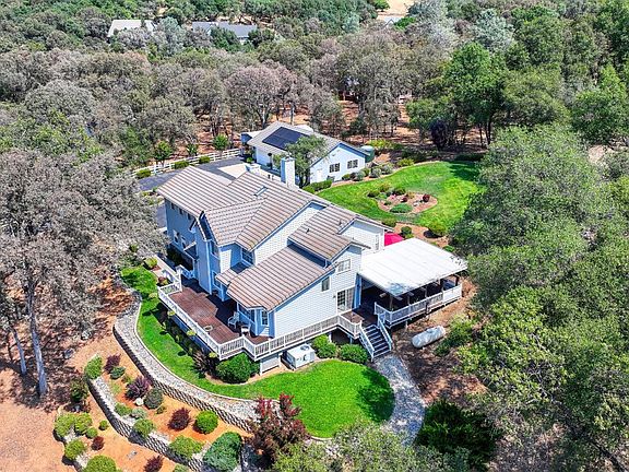 PRICE IMPROVEMENT! Welcome to your dream retreat in the tranquil Christian Valley of North Auburn! This stunning two-story home offers privacy & comfort on 3.4 acres. This home features 4 bedrooms, two and half baths with huge game room and upstairs laundry. Step inside to discover a welcoming formal living and dining room with cathedral ceiling. The home's kitchen showcases granite countertops and stainless steel, built-in appliances. The family room boasts a cozy wood-burning stove. The primary suite is a true sanctuary with a walk-in closet, skylight, and an ensuite that includes a separate shower and soaking tub. Two additional bedrooms also feature walk-in closets. The property includes an owned 8KW solar system with 2 Tesla backup batteries and an EV plug. Sellers have not had an electric bill the past 3 years! The wrap-around deck boasts 500 feet of covered patio, perfect for entertaining. The attached & detached garages accommodate six vehicles. Covered RV parking. Additionally, the 1500sf detached shop/garage or the 800sf barn offers potential for an ADU conversion. Firewise Community. Close to shopping, restaurants, and a hospital, this property offers the ideal blend of privacy and accessibility. Don't miss the chance to call this amazing property home.