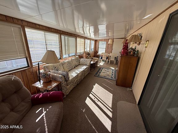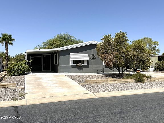 You'll love this well maintained 3 bedroom/2 bath home in Florence Gardens where you own the lot! Easy care front and back yards, plenty of parking in the 2 car carport with extra golf cart parking on the side patio, and full length Arizona Room. Inside is all electric, cook-top stove and lots of counterspace in the kitchen, dining area and spacious living room with just the right amount of furniture! Split floorplan, master bedroom has a Queen bed and master bath has a step-in shower. Two other bedrooms are large and one is set up as an office with workspace. Full size washer/dryer in laundry room, Arizona room is furnished as well.