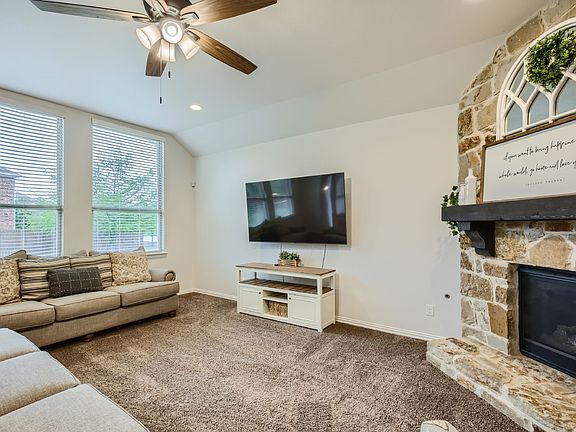 Move-in ready 4 bedroom, 2 bath single-story situated on a large lot and sure to impress. Featuring a brand-new roof and new gutters, this home offers peace of mind along with stylish upgrades. The modern open-concept plan filters natural light throughout. Located off the entry is a dedicated office with French doors and a formal dining room. A large family room with a stone floor-to-ceiling fireplace opens to the spacious eat-in kitchen with a built-in oven and cooktop, granite countertops, tumbled tile backsplash, and stainless steel appliances. The versatile 2nd living area can flex as a media-game room, children's play room, or 5th bedroom option if desired! The private primary retreat is tucked away at the back of the house and offers a walk-in closet and a luxurious en-suite bath with double vanities, a relaxing soaking tub, and a separate shower. Enjoy outdoor living in the backyard with an open patio. Walking distance to community pool.