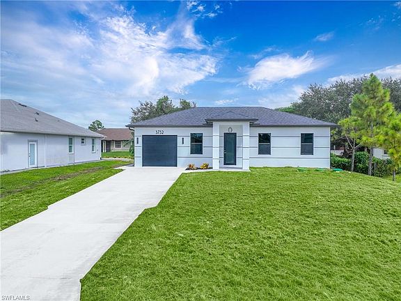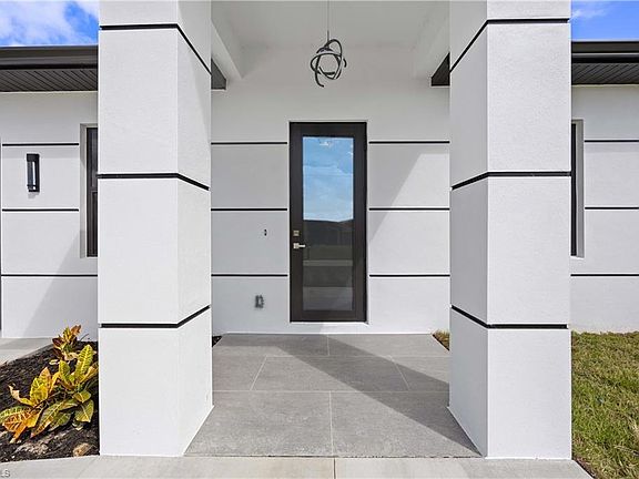 NEW CONSTRUCTION, luxurious contemporary home with plenty of room for parking and located in the heart of Lehigh Acres. This home is impeccably designed and built with attention to every detail. All lights throughout the home are LED, all doors and windows are high impact and includes a sprinkler system. The open floor plan seamlessly blends indoor & outdoor living. Third bathroom is next to the garage, which makes it easily converted into a mother in law suite. Impeccable white 36x36 porcelain title floors with membrane under tile, which prevents cracks from wear and tear. Expansive living room with high 8" interior and exterior doors. The kitchen boasts gorgeous 42" solid wood soft close cabinets with quartz countertops, a broad counter height island along with stainless steel appliances. This home is close to shops, restaurants, schools and THE BEST SW FLORIDA CAN OFFER.