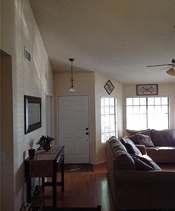 Situated on a cul de sac you will find this Charming Single story 3 bd.+ 2 ba. 1,085 sq. ft. home on a 9,740 sq. ft. lot.Living room has wood flooring, vaulted ceiling, fireplace and ceiling fan. Kitchen has multiple cabinets,vaulted ceiling & an adorable garden window above the sink. Guest bathroom has tile floors,granite counters, spacious master bedroom with vaulted ceiling, neutral carpet,large closet & ceiling fan.Master bathroom has custom tile counters with backsplash,custom tile work in shower and separate toilet area. Large size back yard with an enclosed patio room that offers multiple screened windows to enjoy our desert breeze, built in fire pit & wood patio cover as well. Two car attached garage with hanging cupboards and wood shelves included. Close to amenities and freeway