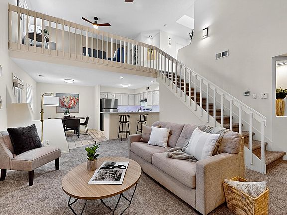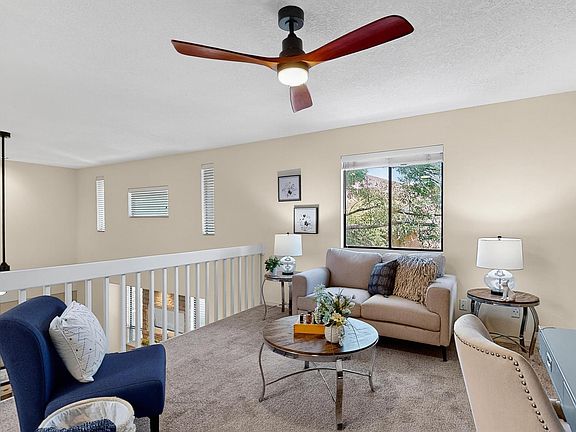 Welcome to this bright and open 2 bedroom, 2.5 bath north valley townhome. Located on a cul-de-sac, the home features an open concept floor plan downstairs w/ 2 bedrooms and a loft/office space upstairs. Fire up the beautiful stacked stone gas log fireplace on a cold evening or enjoy the charming backyard during milder months. Additional features include a pantry, soaring ceilings, a two-car garage and several skylights that provide soft natural light. The backyard is an oasis with a water fountain and loads of shade. With new carpet and fresh paint, this home is move-in ready. It's in a fabulous central location w/ easy access to the Bosque walking & biking trails, the Rio Grande Nature Center, I-25, Old Town, shopping, and restaurants. Come view this rare opportunity before it's gone