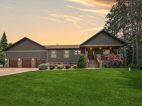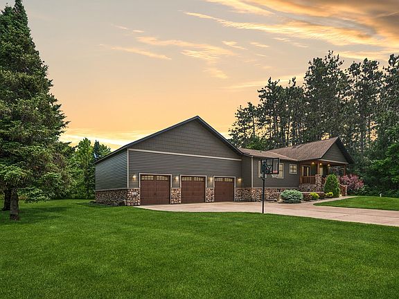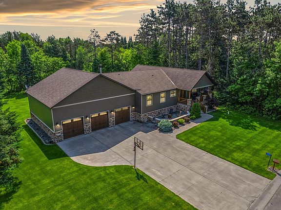 A perfect place to call home! Resting in a quiet cul-de-sac in the sought-after Tall Timbers neighborhood, this impeccable rambler offers over 4,100 FSF of character-rich finished living space on nearly one acre, surrounded by acres of state land. A concrete driveway leads to the expansive 40'x36' garage offering three front overhead doors (9Wx8H) & rear (9Wx8H) overhead door, loft storage & plenty of work space. Exposed aggregate walkways guide you to a spacious front patio & the welcoming covered front porch setting the tone for the quality, detail, and craftsmanship found throughout. Inside, a generous foyer opens into warm hardwood floors, rich wood/log accents, and 6" T & G ceilings. The open layout places all major amenities on the main level. The eat-in kitchen is filled with custom Hickory cabinetry with roll-outs, stone backsplash, under cabinet lighting, Quartz countertops, stainless steel appliances, & a fieldstone-accented breakfast bar. The bay window brightens the adjacent dining area, which flows into the vaulted great room anchored by a striking fieldstone fireplace with raised hearth & mantel. A large patio door opens from this space to a wraparound deck, perfect for entertaining or quiet evenings surrounded by nature. All three spacious main-floor bedrooms include walk-in closets with the primary ensuite featuring a jetted soaking tub, tile walk-in shower, & tile flooring. A full guest bath with travertine tile & the laundry/mudroom complete the main level. The finished lower level was designed for relaxation & entertaining, with surround sound, extensive hardwoods, and custom stonework throughout. Enjoy the media/TV room, an amusement area perfect for a pool table or additional gathering space, and a wet bar lounge complete with a second fireplace, custom cabinetry, bar sink, beverage fridge & multiple TVs that will stay with the home! A full bath with arched stone entry into a soaking tub offers a spa-like retreat, while the dedicated exercise room features rubber mat flooring and an infrared sauna. The lower level utility room offers lots of storage, 2021 furnace, zoned heating, and Aprilaire humidifier to enhance the comfort throughout the home. The exterior features include ABC Seamless steel siding & shakes (2016), gutter, fieldstone accents that wrap the entire home, stamped carriage garage doors with window top sections, beautiful landscaping with an irrigation system, & plenty of outdoor living space - 8'x23' front patio, an 8'x27' covered front porch, and dual rear/side decks (36'x12' and 12'x12') with stairs that lead to a 20' circular fire-pit patio. The lot allows for an accessory structure up to 536 sq ft. This home is simply incomparable & truly one-of-a-kind! Conveniently located near parks, schools, healthcare, everyday amenities & just minutes from I-35, making commuting a breeze! We look forward to your visit!