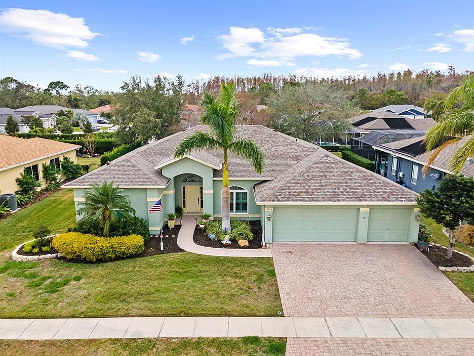 Looking for the CREAM OF THE CROP? You've found it! This extremely well-maintained 3/2 home (plus den/flex space) has only had ONE owner, and is nestled within the Cypress Creek Golf & Country Club, just a MILE from the golf course! This beautifully appointed home is on a spacious QUARTER-ACRE lot and features a 3-car garage with GENEROUS storage cabinets and shelving. With thoughtful design, the main areas of the home feature 10' ceilings and crown molding to create a stylish, open airy feel enhanced by PLANTATION SHUTTERS and WOOD FLOORING. In the great room, open the FOUR-PANEL, GLASS POCKET SLIDERS to bring the outdoors in when you're entertaining or just whenever the weather is nice. The OVERSIZED primary suite is a true retreat, complete with french doors to the LARGE, SCREENED-IN PATIO, TWO WALK-IN CLOSETS, DUAL VANITIES, a large fully enclosed walk-in shower, a SOAKING TUB, and a private water closet - creating a spa-like atmosphere. The secondary bedrooms also feature walk-in closets, providing ample storage, and the secondary bathroom is equally impressive, with a walk-in shower and a convenient door to the back patio. The large kitchen is a chef's dream, featuring a CUSTOM-BUILT walk-in pantry, island with extra storage, solid surface countertops, 42" cabinets with upgraded DRAWER PULL-OUTS, a breakfast bar, and a charming eat-in area that overlooks the spacious backyard. Another set of French doors there will lead you to the back patio. Some additional highlights include a LARGE LAUNDRY ROOM with a utility sink and tons of storage space...PLUS two new, UPGRADED, DOUBLE-PANED WINDOWS on the front of the home (primary ensuite and den windows). The big ticket items have been taken care of for you....2023 ROOF....and a 2021 HVAC (serviced twice a year), and you'll appreciate the practicality of having rain gutters, hurricane shutters, and an irrigation system. Not a 55+ community, La Paloma is located 2 minutes from I-75, making commutes to Tampa, Sarasota, or St Pete very convenient. You'll be just around the corner from all the shopping, dining, and entertainment you could want! Several world famous beaches are just a short drive away! Schedule time to see this gorgeous home today!