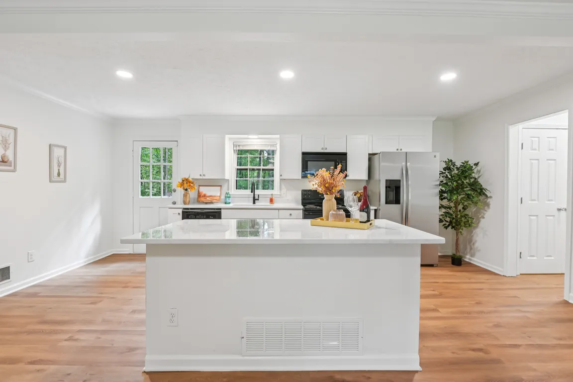 Brand-new back deckOversized islandOpen floor planLevel tree-lined yardNew appliancesLarge pantryUpdated lighting