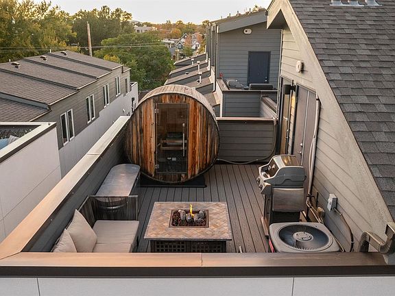 Custom rooftop saunaPanoramic city skyline viewsExpansive trex-deck rooftop patioModern comfortOpen-concept main floorQuartz countertopsSoft-close cabinetry