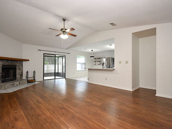 Ceramic tileOpen concept living spaceWood burning fireplaceVinyl plank flooringSpacious screen porchRemodeled kitchenStainless steel refrigerator